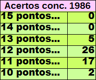 Os grupos que falharem, serão listados no final da tabela e estarão em amarelo. Os valores em vermelho foram as pontuações que deram no sorteio 1986. Neste sorteio só ocorreram pontuações fixas de 11 a 13 pontos.