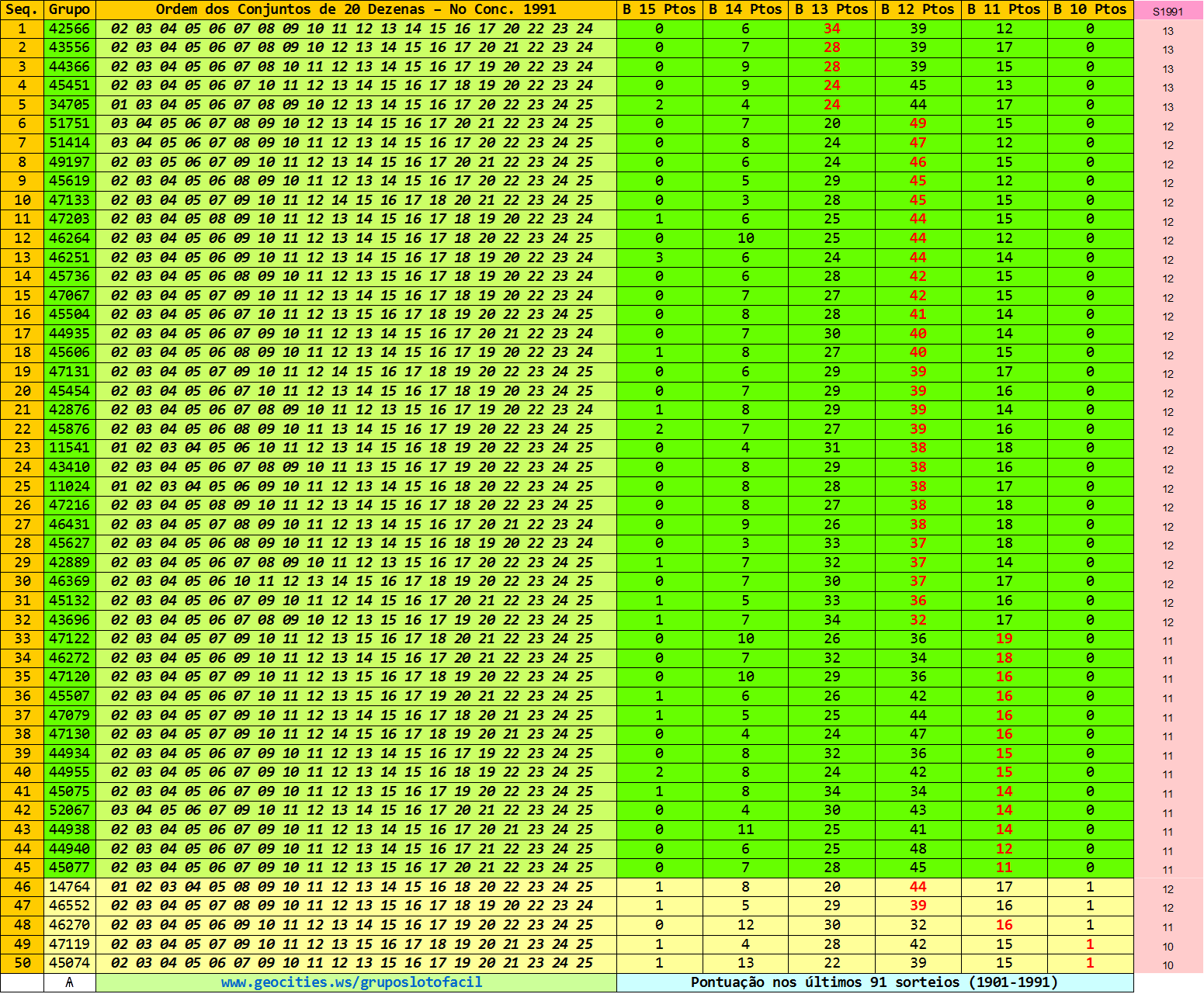 Os grupos que falharem, serão listados no final da tabela e estarão em amarelo. Os valores em vermelho foram as pontuações que deram no sorteio 1999.